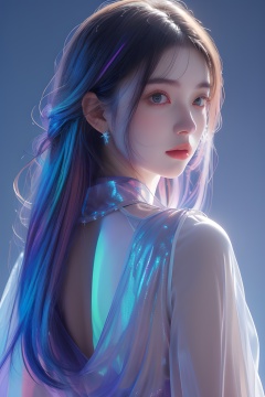 1girl,jewelry, iridescence, look back, upper body,light pink background, (32k, best quality, highres, masterpiece:1.21), (realistic:1.331), detailed and intricate, (iridescent hair:1), <lora:20240218-1708234260649:0.4>, <lora:幻光琉璃Phantasmal Luminous The Radiance of Rainbow Dispersion:0.6>