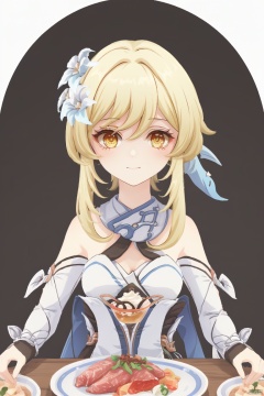 lumine, 1girl, lumine \(genshin impact\), blonde hair, hair ornament, flower, food, hair flower, solo, dress, holding, yellow eyes, white dress, bare shoulders, detached sleeves, bangs, cup, short hair with long locks, fish, breasts, hair between eyes, meat, eating, sidelocks, plate, gloves, white flower