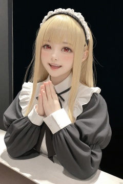 masterpiece,Realism,best quality,loli,1girl, solo, blonde hair, red eyes, long hair, looking at viewer, smile, long sleeves, open mouth, upper body, black background, bangs, blush, hairband, :d, own hands together, puffy sleeves, frills, bow, ribbon, white shirt, shirt, hands up, BREAK, fine fabric emphasis, best quality,amazing quality,very aesthetic,absurdres,masterpiece,best quality,amazing quality,very aesthetic,absurdres<lora:EMS-288516-EMS:0.000000>, <lora:EMS-300688-EMS:0.000000>, <lora:EMS-301024-EMS:0.300000>, <lora:EMS-339656-EMS:0.000000>, <lora:EMS-324355-EMS:0.000000>, <lora:EMS-344883-EMS:0.000000>