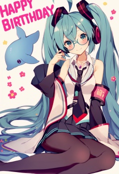 masterpiece, best quality,1girl, hatsune miku,  long hair, twintails, solo, glasses, very long hair, bespectacled, sitting, happy birthday, aqua hair, whale, jewelry, fish, smile, ahoge, aqua eyes, ring, bird, legs, pigeon, blush, pantyhose, headphones, necktie, simple background, necklace, armband, key, absurdly long hair, detached sleeves, skirt, flower <lora:yumenouchiXLlokr-000049:1>