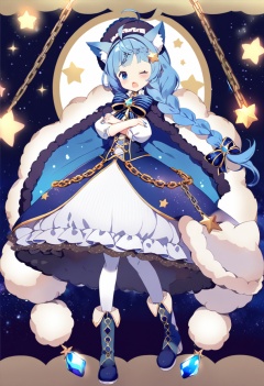 masterpiece, best quality,1girl, solo, braid, blue footwear, blue eyes, one eye closed, ahoge, blue nails, puffy sleeves, bow, boots, star \(symbol\), fur trim, looking at viewer, hat, jewelry, gem, long sleeves, bangs, hair ornament, full body, hair bow, open mouth, nail polish, long hair, brooch, blue headwear, cape, puffy long sleeves, single braid, blue cape, animal ears, dress, blue skirt, ;o, blue bow, kneehighs, skirt, chain, x hair ornament, blue gemstone, thighhighs, striped, socks, hairclip, blush, starry sky print, tearing up, striped bow, frilled headwear, very long hair, fur-trimmed cape, blue hair, cat ears, sidelocks, star hair ornament, crossed arms, vertical stripes, hairband, cat girl, star \(sky\), space print, petticoat, white background, layered dress, starry background, standing, white thighhighs <lora:yumenouchiXLlokr-000049:1>