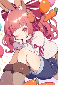 masterpiece, best quality,1girl,   animal ears, one eye closed, hair ornament, shorts, food-themed hair ornament, ribbon, boots, rabbit, solo, smile, carrot hair ornament, pink hair, rabbit ears, red ribbon, long hair, animal, head rest, bow, tail, hair ribbon, sparkle, blue shorts, black shorts, closed mouth, blush, fur-trimmed boots, balloon, bangs, fur trim, hair bow, ;\), pink ribbon, animal ear fluff, puffy shorts, long sleeves, rabbit tail, artist name, red bow, blunt bangs, squirrel, rabbit girl, squirrel tail, shirt, knees, pink eyes, white shirt, red hair, eyelashes, turtleneck, looking at viewer <lora:yumenouchiXLlokr-000049:1>