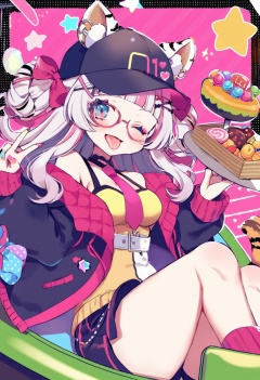 masterpiece, best quality,1girl,   headphones, animal ears, food, solo, candy, lollipop, one eye closed, bangs, hat, hair ornament, tail, glasses, long hair, handheld game console, baseball cap, looking at viewer, breasts, pink hair, jewelry, tongue, controller, heart, bow, nail polish, x hair ornament, blunt bangs, open mouth, tiger ears, smile, ring, tiger tail, jacket, blush, necktie, tray, star \(symbol\), tongue out, multicolored nails, bumper car, hair bow, ;d, cleavage, tiger girl, game controller, v, blue eyes, sitting, white hair <lora:yumenouchiXLlokr-000049:1>