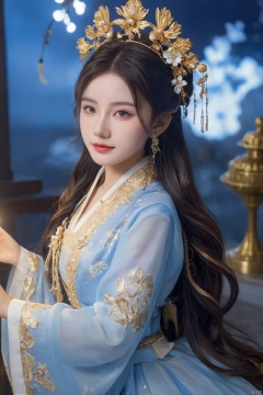 HUBG_Rococo_Style(loanword), 1girl, hanfu, Portrait of noble and graceful goddess, dressed in blue and gold, elaborate coiffure hairstyle, dark hair, decoration, 16K, UHD, HDR, Brilliant scene with bright lights, mist, numerous decorations, joyful atmosphere, light smile,HDR, IMAX, 8K resolutions, ultra resolutions, magnificent, best quality, masterpiece,cinematic scenes, cinematic shots, cinematic lighting, volumetric lighting, ultra-detailed, hubg_beauty_girl
