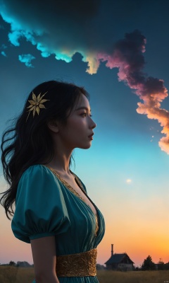 1girl, (from side), (silhouette:1.2), profile, big hair, masterpiece, best quality, light particle, depth of field, field, scenery, fantasy, indigo light, (far away:1.1), cute girl, midriff, tribal sash, pastel colors, chromatic aberration, glow in the dark dark, cloudy sky, space, orange aura, aura, cinematic, dark atmosphere, night , dark hole, glowing eyes, teal light, illumination, light rays, eye in the sky, (grass:0.9), falling petals, oniric portrait of a tall cloaked figure with a white mask, Azem the Traveler, yearning to explore the ends of the world to discover its wonders and help its denizens, by Andy Kehoe, a gradient masterpiece, blue cyan yellow, Rococopunk, luminism, seamless, China ink, Ink Bubbles, Gold leaf lines, alcohol ink elements, curved lines, cinematic, realism, chiaroscuro, Shadow play, Gold leaf small lines, bright splashes of alcohol ink puddles, volumetric light, auras, rays of sunlight, bright colors reflect, isometric, digital art, smog, pollution, toxic waste, chimneys and railroads, 3d render, octane render, volumetrics, by greg rutkowski, anime style