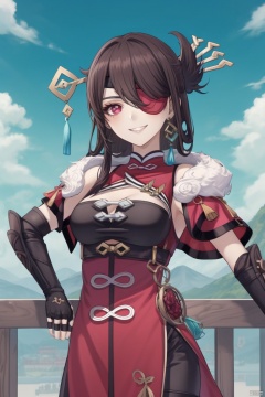beidou, 1girl, beidou \(genshin impact\), eyepatch, solo, breasts, long hair, gloves, red eyes, smile, hair ornament, brown hair, fingerless gloves, cleavage, looking at viewer, hairpin, black gloves, red dress, one eye covered, fur trim, dress, red capelet, grin, clothing cutout, hair stick, capelet, cleavage cutout, hair over one eye, sky, earrings, bare shoulders, jewelry, large breasts, elbow gloves, bangs
