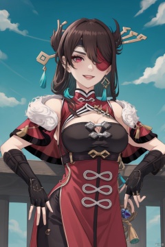beidou, 1girl, beidou \(genshin impact\), eyepatch, solo, breasts, long hair, gloves, red eyes, smile, hair ornament, brown hair, fingerless gloves, cleavage, looking at viewer, hairpin, black gloves, red dress, one eye covered, fur trim, dress, red capelet, grin, clothing cutout, hair stick, capelet, cleavage cutout, hair over one eye, sky, earrings, bare shoulders, jewelry, large breasts, elbow gloves, bangs