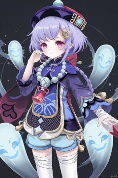 qiqi, 1girl, qiqi \(genshin impact\), hat, necklace, beads, jewelry, snowflakes, bead necklace, purple hair, thighhighs, long sleeves, solo, hair ornament, braid, bangs, ghost, long hair, wide sleeves, purple eyes, shorts, qing guanmao, coin hair ornament, bandages, purple headwear, tassel, full body, vision \(genshin impact\), jiangshi, closed mouth, white thighhighs, looking at viewer, dress
