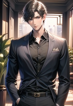 (best quality), ((masterpiece)), (highres), illustration, original, extremely detailed,male focus, 1boy, solo, shirt, black hair, looking at viewer, black shirt, short hair, plant, jacket, belt, formal, collared shirt, indoors, pants, suit, standing, black belt, long sleeves, closed mouth, black pants, black jacket