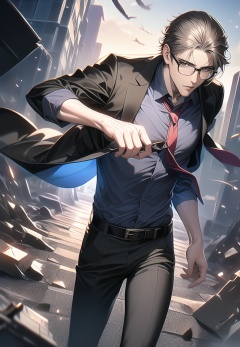 (best quality), ((masterpiece)), (highres), illustration, original, extremely detailed,1boy, male focus, solo, belt, shirt, glasses, pants, necktie, black belt, jacket, formal, short hair, red necktie, outdoors, black jacket, debris, suit