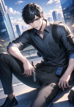 (best quality), ((masterpiece)), (highres), illustration, original, extremely detailed,1boy, weapon, gun, male focus, black hair, blood, solo, shirt, holding weapon, holding, handgun, holding gun, black pants, outdoors, sitting, pants, building, day, short hair, sky, belt, blue shirt, collared shirt, cloud, pouch