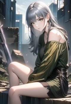 (best quality), ((masterpiece)), (highres), illustration, original, extremely detailed,1girl, solo, sitting, long hair, looking at viewer, weapon, sword, off shoulder, jacket, bangs, outdoors, closed mouth, yellow eyes, grey hair, ruins, green eyes, feet out of frame, bare legs, bare shoulders, hand between legs