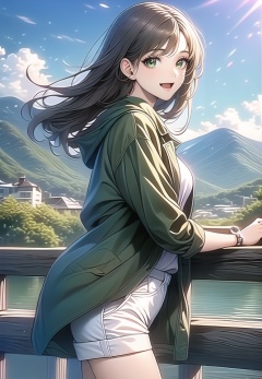(best quality), ((masterpiece)), (highres), illustration, original, extremely detailed,1girl, outdoors, solo, long hair, green eyes, shorts, sky, smile, railing, white shorts, green jacket, day, looking at viewer, blue sky, open mouth, brown hair, watch, white shirt, shirt, cloud, ocean, open clothes, wristwatch, green coat, jacket, bangs, bridge, against railing, mountain, cityscape, cowboy shot, mountainous horizon, standing, building