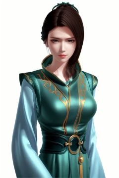 ((HRD, HUD, 8K)),((masterpiece, best quality)), highly detailed,1girl, solo, hair bun, brown hair, long hair, black hair, brown eyes, lips, chinese clothes, green dress, dress, simple background, white background, upper body, standing, looking at viewer,  <lora:20240511-1715391469403:0.72>