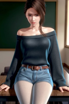 ((HRD, HUD, 8K)),((masterpiece, best quality)), highly detailed,1girl, solo, hair bun, brown hair, long hair, black hair, brown eyes, lips, (off-shoulder sweater:1.2), denim shorts, black pantyhose, blurry background, classroom, chalkboard, sitting, cowboy shot, looking at viewer, <lora:20240511-1715391469403:0.7>