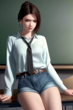((HRD, HUD, 8K)),((masterpiece, best quality)), highly detailed,1girl, solo, hair bun, brown hair, long hair, black hair, brown eyes, lips, (white shirt:1.2), necktie, denim shorts,blurry background, classroom, chalkboard, sitting, cowboy shot, looking at viewer, <lora:20240511-1715391469403:0.7>