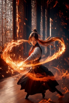 orang-aura,using orang-magic,orang-magic,ancient-costume,dancing,solo,1girl,fire,long hair,ponytail,<lora:magic_fighting_768:0.8>,