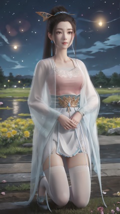 yyr,1girl,solo,long hair,ponytail,dress,brown hair,white thighhighs,flower,long sleeves,chinese clothes,black hair,hair ornament,wide sleeves,see-through,realistic,closed mouth,breasts,very long hair,high ponytail,night,petals,skirt,earrings,(flower field:1.3),(tanono:1.3),starry_sky,(river:1.2),waterfall,rock,shoes,mizu,rose petals,cowboy shot,kneeling,