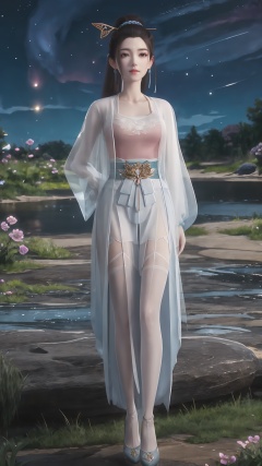 yyr,1girl,solo,long hair,ponytail,dress,brown hair,white thighhighs,flower,long sleeves,chinese clothes,black hair,hair ornament,wide sleeves,see-through,full body,realistic,closed mouth,breasts,very long hair,high ponytail,night,petals,skirt,earrings,(flower field:1.3),(tanono:1.3),starry_sky,river,waterfall,rock,sitting on a stone,high_heels,shoes,