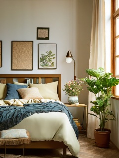 XCYP HOME,cream style heige,no humans,scenery,bed,lamp,plant,indoors,curtains,pillow,couch,window,sunlight,bedroom,potted plant,table,book,flower pot,a bedroom with a bed,desk,and a chair in it with a plant on the side of the bed,Carol Bove,soft lights,a 3D render,light and space,unreal engine 5 highly rendered,a digital rendering,cloisonnism highly detailed digital painting,an ultrafine detailed painting,modern european ink painting,photography,photos,depth of field,8K,high definition details,extreme clarity,