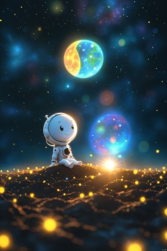 Two cartoon characters in white astronaut suits, a little boy sitting on a small moon and a little girl sitting on another small planet, cosmic background, c4d, IP by pop mart, Disney Pixar style characters, bright colors, HD rendering , wide angle, visual, clay material, animated lighting, high quality, ultra high definition