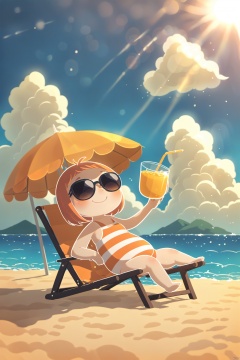 anthropomorphic, a chubby cloud with sunglasses, drinking juice, lying on a lounge chair by the sea. Sunbathing, cute drawing style, warm colors, flat illustration