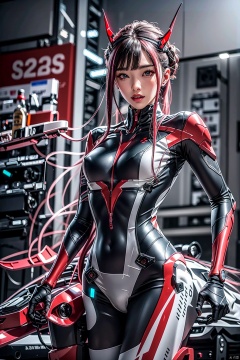 The 02 characters in the DARLING in the FRANXX have distinct appearance characteristics. She has long pink hair and green eyes, with red marks around her eyes, which makes her look mysterious and charming. It has a pair of red horns on its head and is equipped with mechanical devices to show its special status. The fangs and unique nails in the smile add a touch of wild beauty. In terms of dress, she prefers red uniforms with black pantyhose and white boots, which are both fashionable and full of fighting atmosphere. When driving FRANXX, she changed into red tights and high heels, which made her look more heroic., 1girl, solo