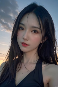 NSFW,Frontal photography,Look front,evening,dark clouds,the setting sun,On the city rooftop,A 20 year old female,Black top,Black Leggings,black hair,long hair, dark theme, muted tones, pastel colors, high contrast, (natural skin texture, A dim light, high clarity) ((sky background))((Facial highlights)), Light master, 1girl