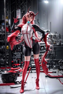 The 02 characters in the DARLING in the FRANXX have distinct appearance characteristics. She has long pink hair and green eyes, with red marks around her eyes, which makes her look mysterious and charming. It has a pair of red horns on its head and is equipped with mechanical devices to show its special status. The fangs and unique nails in the smile add a touch of wild beauty. In terms of dress, she prefers red uniforms with black pantyhose and white boots, which are both fashionable and full of fighting atmosphere. When driving FRANXX, she changed into red tights and high heels, which made her look more heroic., 1girl, solo(PinkWith a stick in his mouthWith a lollipop in his mouth.)
