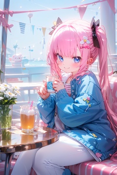 (best quality),(masterpiece),1girl, solo, cup, food-themed hair ornament, short sleeves, food, hair ornament, flower, open jacket, closed mouth, open clothes, holding, bangs, smile, jacket, candy hair ornament, drinking straw, pennant, hair flower, twintails, wrist scrunchie, scrunchie, holding cup, looking at viewer, pants, sitting, long hair, blue eyes, blush, candy wrapper, jewelry, striped, dress, white flower, striped bow, bendy straw, blue jacket, feet out of frame, disposable cup, knees up, macaron, bow, teacup, string of flags, pink scrunchie, ice cube, ringlets
