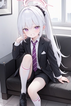 shirt, long sleeves, jacket, white shirt, ponytail,necktie, shoes, shorts, socks, collared shirt, pink eyes, black footwear, grin, black jacket, kneehighs, black shorts, formal, scrunchie, suit, white socks, red necktie, hair scrunchie, black scrunchie, mustukiSuit,