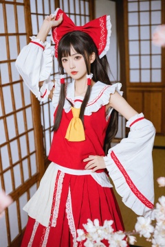 masterpiece,Realism,best quality,loli,1girl,hakurei reimu,bow,solo,hair bow,hair tubes,red bow,ascot,red skirt,detached sleeves,frills,hand on own hip,skirt,long hair,realistic,wide sleeves,brown hair,yellow ascot,blurry,frilled bow,frilled shirt collar,ribbon-trimmed sleeves,red lips,cherry blossoms,ribbon trim,shirt,lips,sidelocks,skirt set,parted lips,looking at viewer,makeup,sliding doors,red shirt,depth of field,hand up,indoors,red vest,brown eyes,sleeveless shirt,lipstick,blurry foreground,arm up,ponytail,flower,black hair,sleeveless,black eyes,dutch angle,long sleeves,ribbon,parody,cowboy shot,vest,