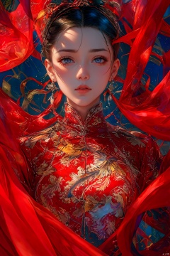 1girl, solo, long hair, looking at viewer, brown hair, black hair, dress, brown eyes, jewelry, closed mouth, upper body, earrings, hand up, makeup, chinese clothes, red dress, portrait, red lips, red theme, a girl,cool, illustration, painting