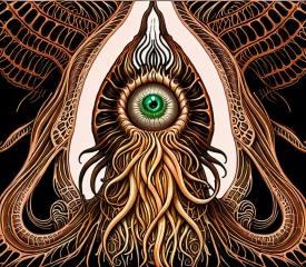 Cthulhu terror,abstract,digital art,surreal,biomorphic,tentacles,eye,organic textures,fractal,brown tones,green eye,intricate patterns,eerie,fantasy,high-resolution image,vertical composition,artist signature,glowing elements,depth,alien-like forms,symmetrical design,cthulhu mythos,lovecraftian horror,<lora:kesulu-10:0.6>,