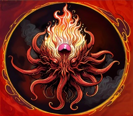 Cthulhu terror,The Old Ruler of the Old Days,Ktugea,and his minion race,the Fire Vampires,surreal art,abstract entity,flame,warm colors,red background,floating object,tendrils,orbs,circular patterns,smoke effect,glowing,fantasy,oil painting style,mysterious,unidentifiable subject,dynamic texture,vibrant hues,eerie atmosphere,cthulhu mythos,lovecraftian horror,<lora:kesulu-10:0.6>,