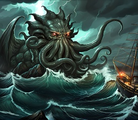 Cthulhu terror,kraken,mythical creature,sea monster,ocean storm,shipwreck,dark color palette,fantastical art,digital painting,tumultuous waves,lightning,tentacles,dramatic scene,rocks,ship,ominous atmosphere,cinematic composition,fantasy genre,large scale creature,marine setting,turbulent weather,nautical disaster,eerie mood,dynamic lighting,high detail illustration,art.,cthulhu mythos,lovecraftian horror,<lora:kesulu-10:0.6>,