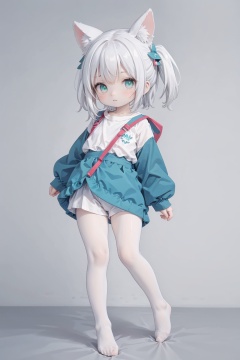 masterpiece,best quality,high quality,(colorful),[Artist miwano rag],[Artist toosaka asagi],[Artist wlop],[Artist chen bin],loli,1girl,solo,petite,loli,elf girl,pointy_ears,small breast,looking at viewer,simple background,white background,Plush doll clothing,white long sleeves,white clothes,animal ears,rabbit ears,hair between eyes,closed mouth,full body,shorts,alternate costume,pointy ears,looking back,hood,from behind,rabbit ears,white footwear,bent over,rabbit tail,hood up,white plush thighhighs,white shorts,animal hood,rabbit hood,(chibi:0.1),white hair,green hair,green eyes,symbol-shaped pupils,bangs,cross-shaped pupils,hair ornament,gradient hair,nahida (genshin impact),yellow mix cyan,