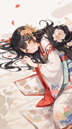 apple_caramel,best quality,masterpiece,realistic,(simple background:1.3),hair ornament,1girl,solo,black hair,long hair,mountain,cloud,(flower:1.2),upper body,wind,hanfu , hair ornament , chinese clothes,leaf,lying,(on side:1.5),ink wash painting,ink,head hold