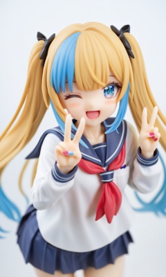 1girl,one_eye_closed,solo,blue_eyes,multicolored_hair,pink_hair,bow,blue_hair,smile,hair_bow,v,school_uniform,quad_tails,open_mouth,long_hair,blonde_hair,looking_at_viewer,blush,skirt,white_background,pink_nails,nail_polish,simple_background,sailor_collar,serafuku,multicolored_nails,bangs,