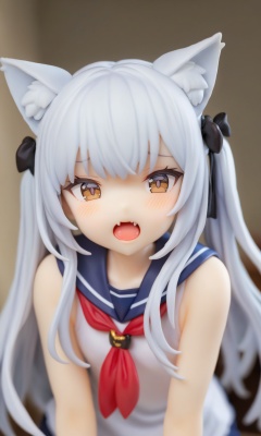 masterpiece,best quality,1girl,sensitive,long hair,blush,open mouth,gloves,bow,animal ears,brown eyes,white hair,hair bow,fang,cat ears,sailor collar,black bow
