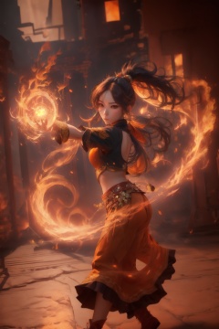 orang-aura,using orang-magic,orang-magic,ancient-costume,dancing,solo,1girl,fire,long hair,ponytail,<lora:magic_fighting_512_15:0.8>,