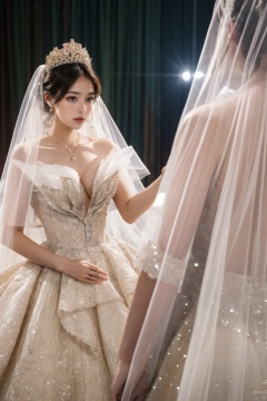 Ultra-clear 8k, real, night, smile, crown, necklace, perspective, hanger, nudity, diamonds, bridal veil, Golden wedding dress, 1 girl,