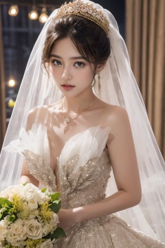 Ultra-clear 8k, real, night, smile, crown, necklace, perspective, hanger, nudity, diamonds, bridal veil, Golden wedding dress, 1 girl,