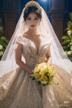 Ultra-clear 8k, real, night, smile, crown, necklace, perspective, hanger, nudity, diamonds, bridal veil, Golden wedding dress, 1 girl,