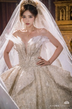 Ultra-clear 8k, real, night, smile, crown, necklace, perspective, hanger, nudity, diamonds, bridal veil, Golden wedding dress, 1 girl,