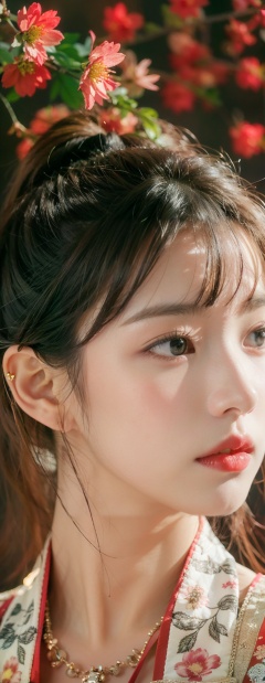 1girl,solo,black hair,long hair,jewelry,bangs,looking at viewer,blunt bangs,grey eyes,branch,upper body,flower,lips,straight hair,closed mouth,black background,red lips,beads,moyou,黄色头发,蓝色眼睛