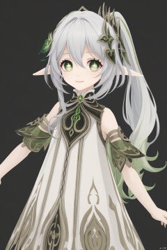 nahida, cross-shaped pupils, 1girl, nahida \(genshin impact\), solo, green eyes, looking at viewer, hair between eyes, hair ornament, symbol-shaped pupils, pointy ears, side ponytail, bangs, simple background, long hair, gradient hair, sidelocks, multicolored hair, smile, black background, detached sleeves, grey hair, white hair, short sleeves, white dress