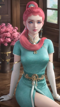 lyy,solo,1girl,jewelry,earrings,long hair,red hair,looking at viewer,realistic,lips,ponytail,blue eyes,chinese clothes,closed mouth,pink hair,eyelashes,hair ornament,nose,(flower field:1.2),cowboy shot,hpflower,white footwear,(boots:1.2),day,cowboy shot,aestheticism,a slit skirt,indoor,table,teatix,vase,sitting,windowsill,window,