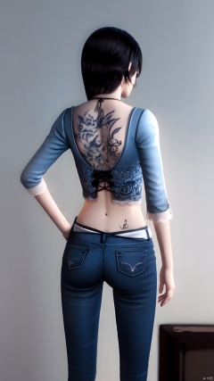 HeiZeLin, dark blue daily clothes,black jeans, breasts, short hair, simple background, black hairm, lace, navel, white belt, black pants, necklace, hand on hip, realistic, Neck rope, back, from behind, facing away, tattoo