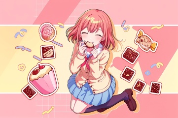 masterpiece,best quality,ultra-detailed,<lora:这应该是个壁纸Lora:1.1>,1girl,food,skirt,blue skirt,closed eyes,solo,pleated skirt,socks,candy,cupcake,holding,cardigan,black socks,eating,^_^,neckerchief,onigiri,bangs,facing viewer,pink cardigan,cup,smile,long sleeves,school uniform,holding food,closed mouth,bowl,kneehighs,blush,full body,ribbon,red neckerchief,cookie,chocolate,red ribbon,